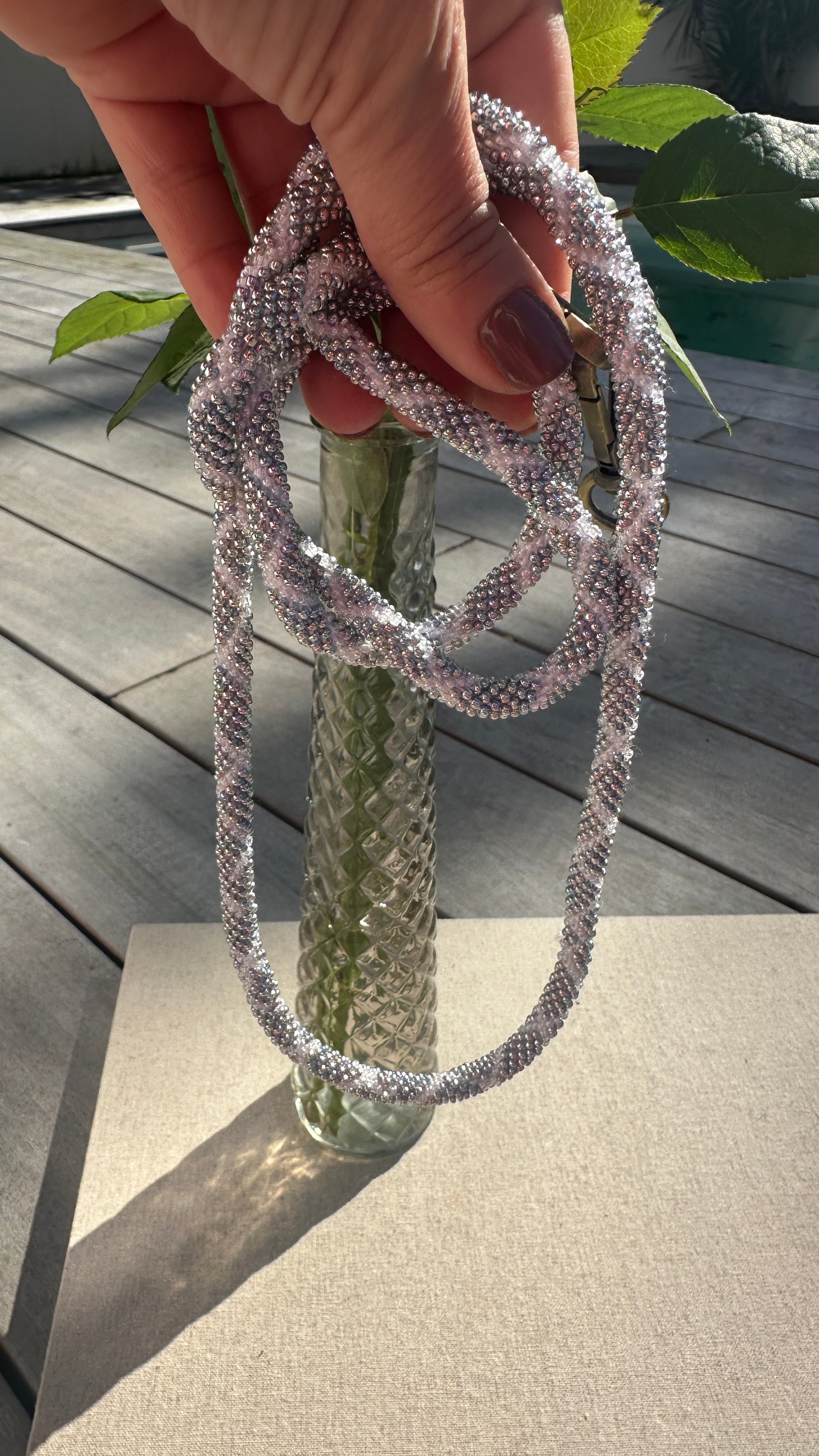 8 heures de confection : Chaque perle est minutieusement enfilée une à une, puis crochetée pour donner naissance à un tissage résistant et raffiné.