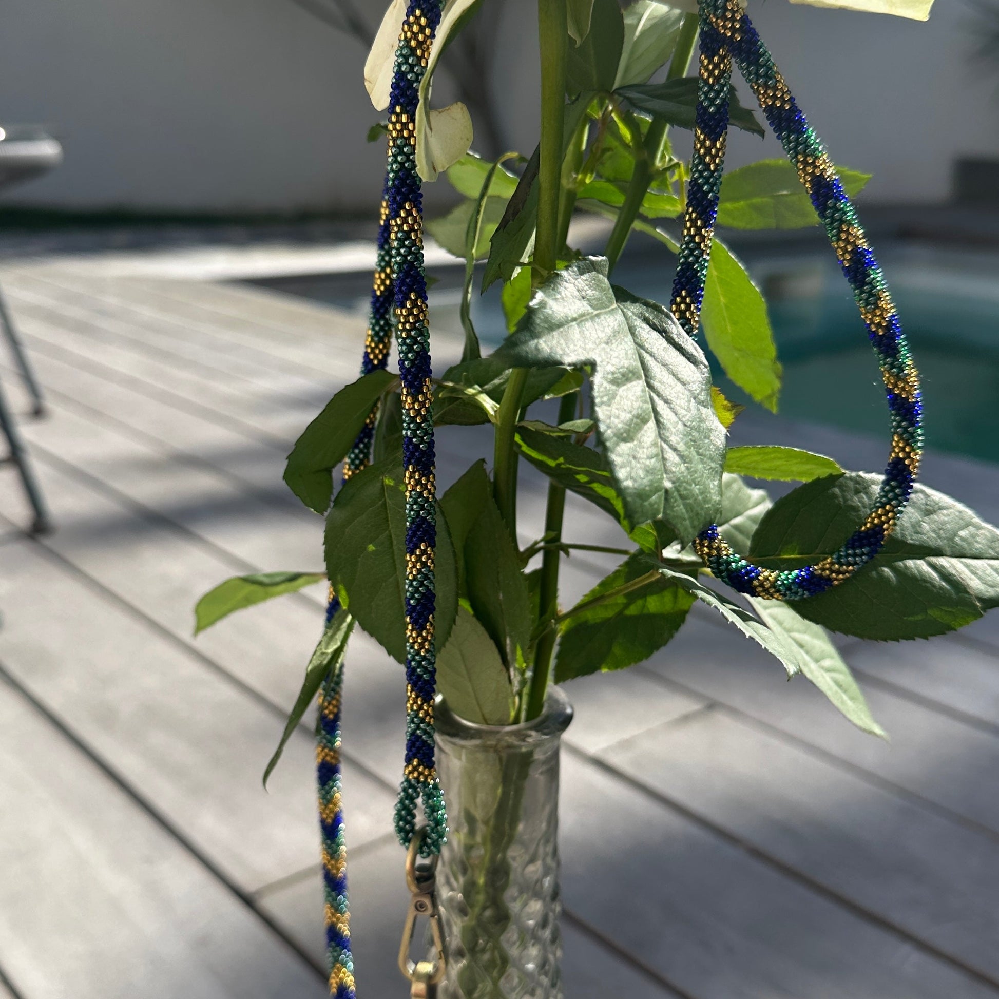 Cordon de Téléphone en Perles de verre – unique, tendance et responsable #A29 bleu marine, vert et doré