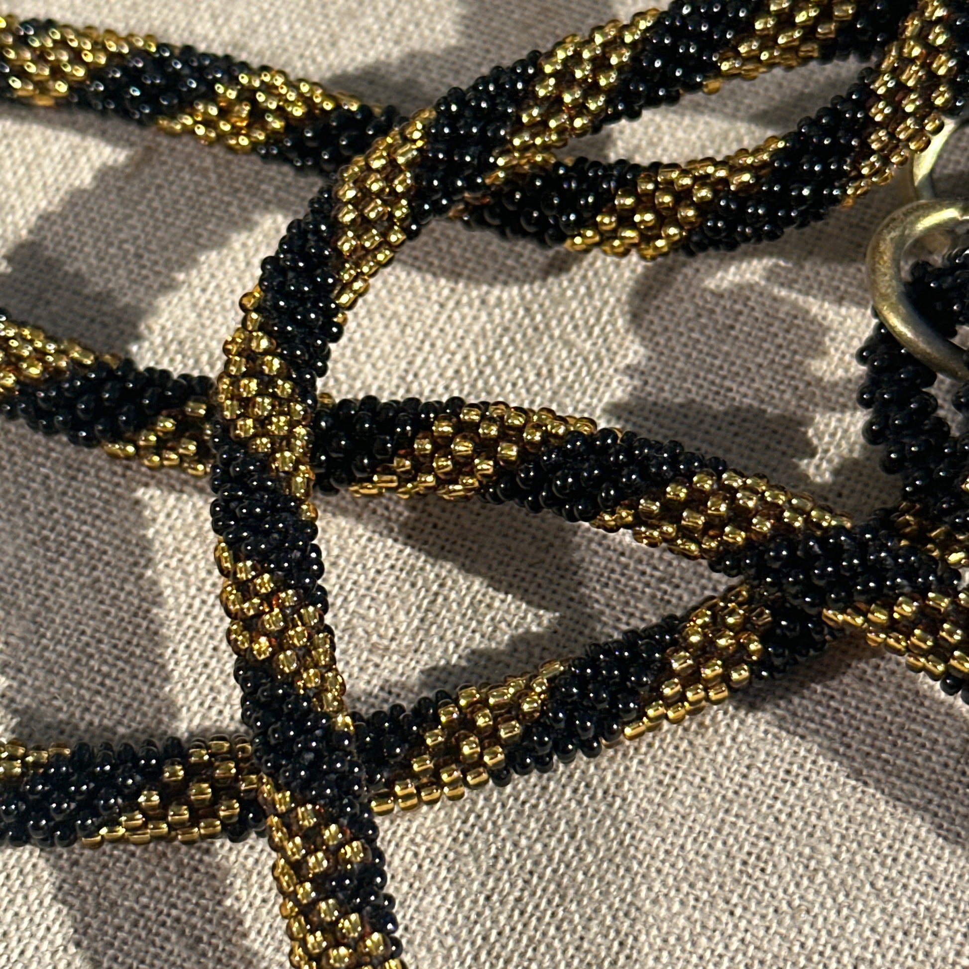 8 heures de confection : Chaque perle est minutieusement enfilée une à une, puis crochetée pour donner naissance à un tissage résistant et raffiné.
