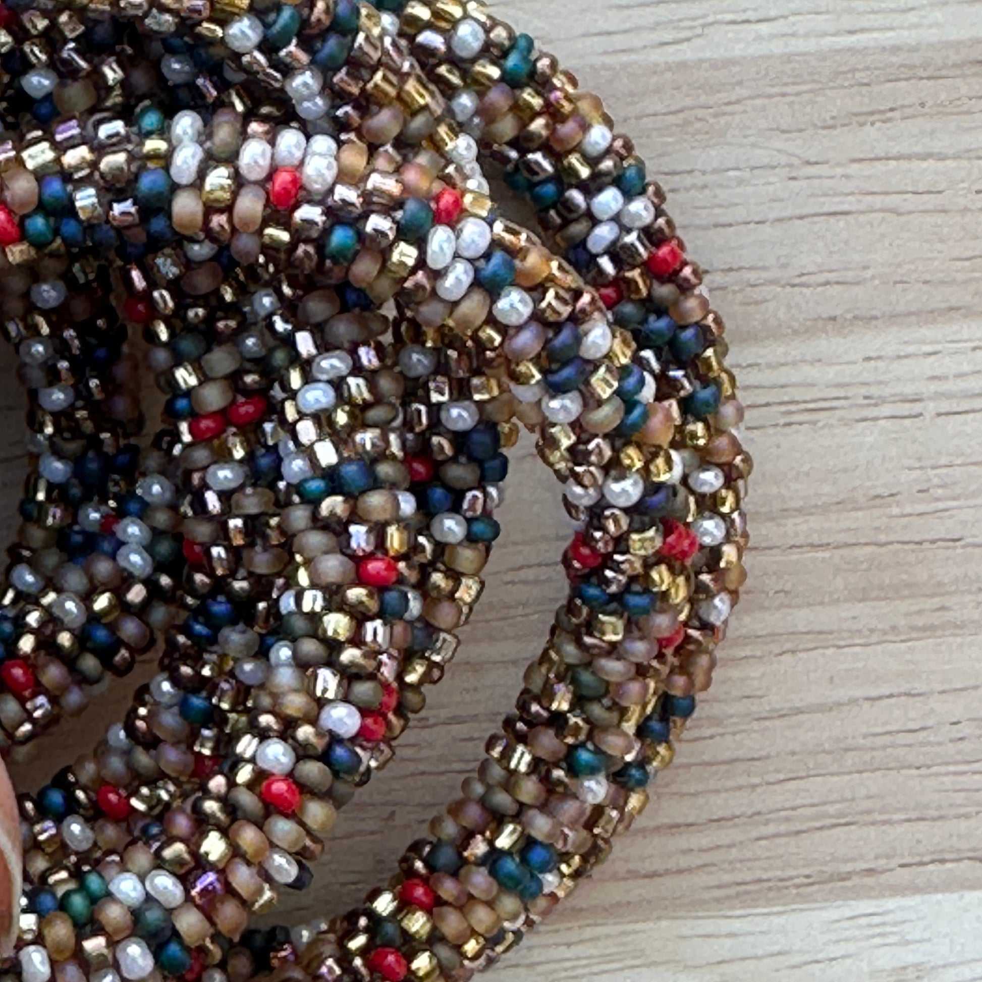 Chaque bracelet est conçu à partir de perles de verre enfilées sur un fil de coton résistant, selon une technique de crochetage en tube, qui donne au bijou toute sa souplesse et son confort. Les motifs et dessins sont parfois inspirés de traditions locales, parfois totalement libres : c’est ce qui rend chaque modèle unique.