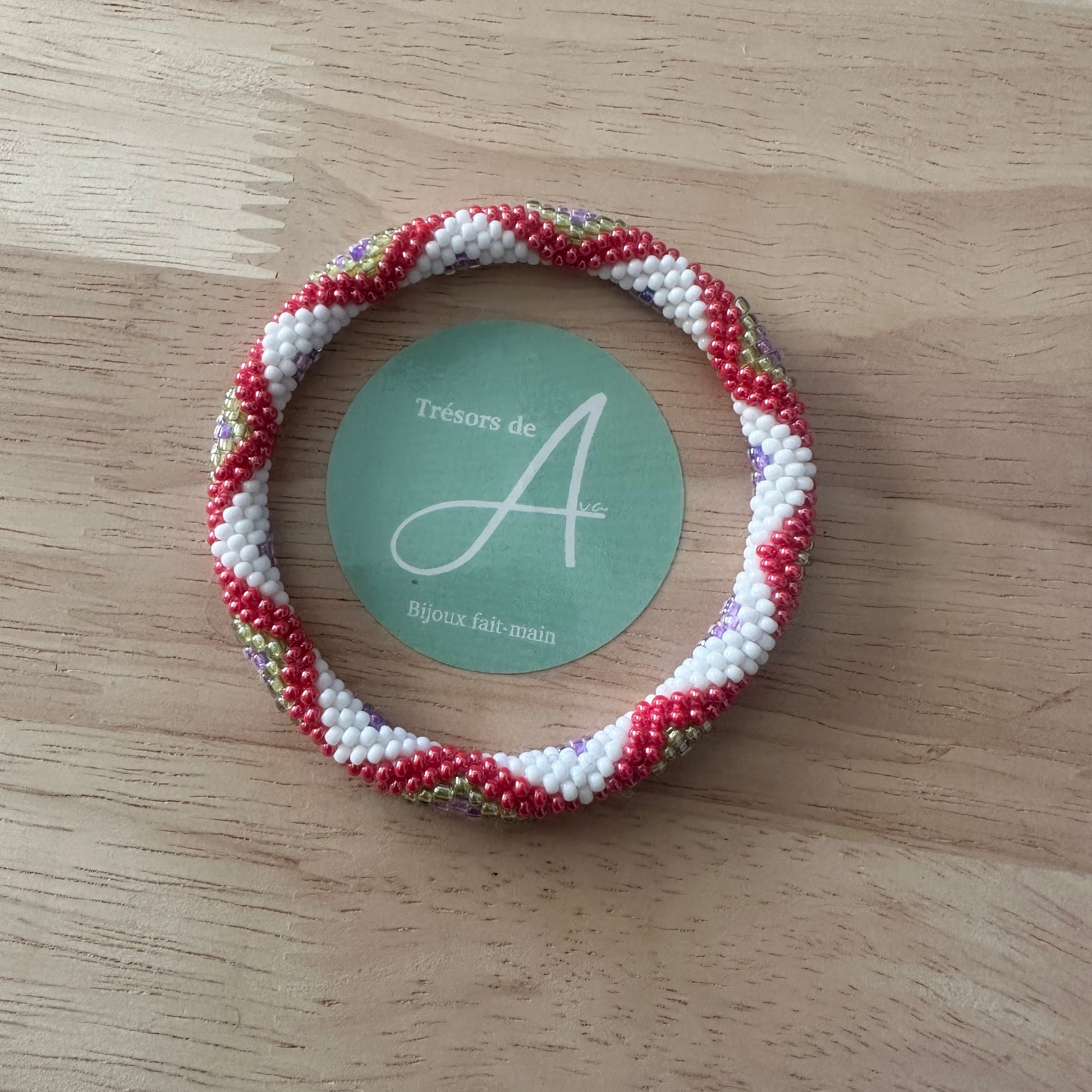 Chaque bracelet est conçu à partir de perles de verre enfilées sur un fil de coton résistant, selon une technique de crochetage en tube, qui donne au bijou toute sa souplesse et son confort. Les motifs et dessins sont parfois inspirés de traditions locales, parfois totalement libres : c’est ce qui rend chaque modèle unique.