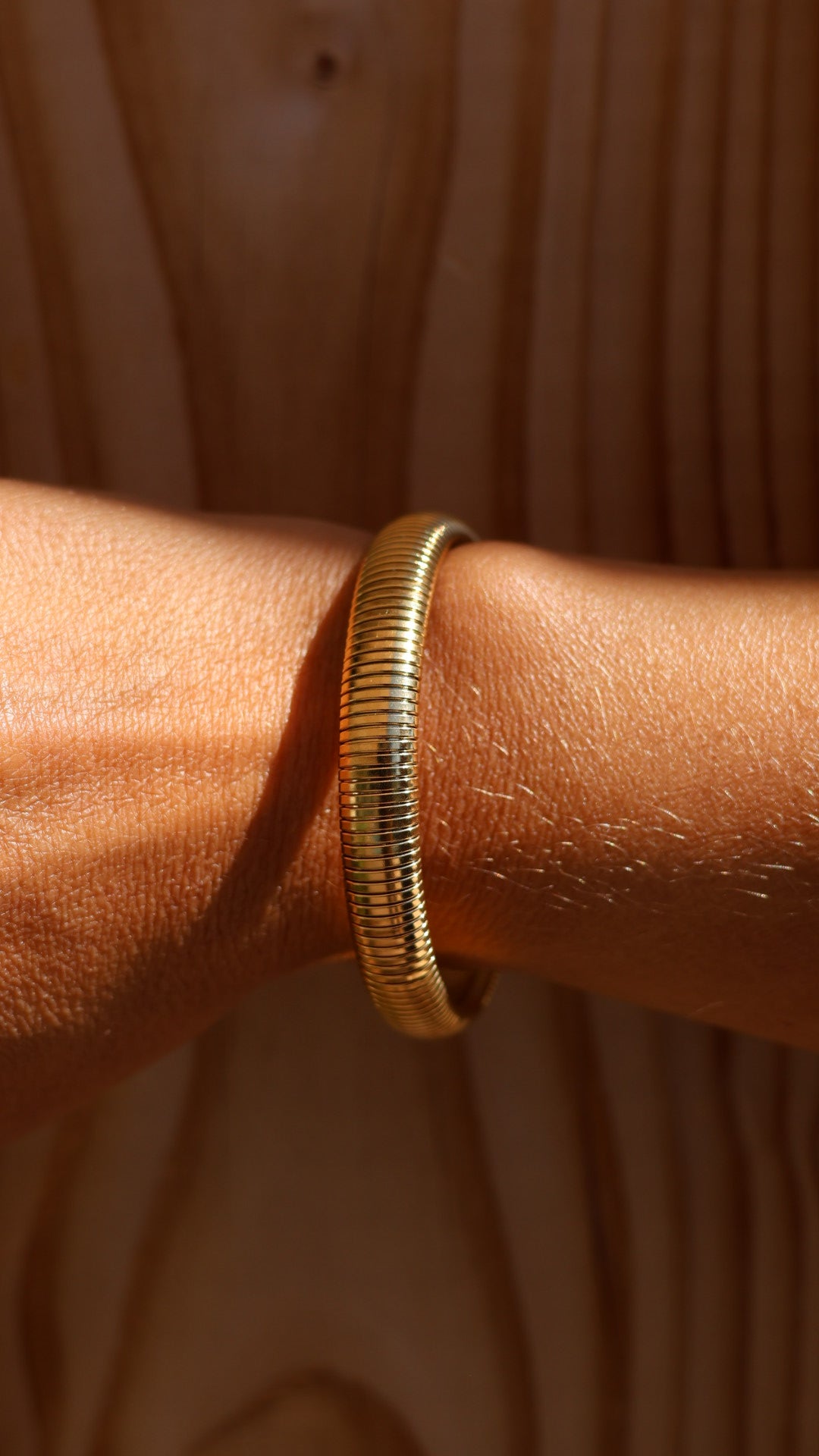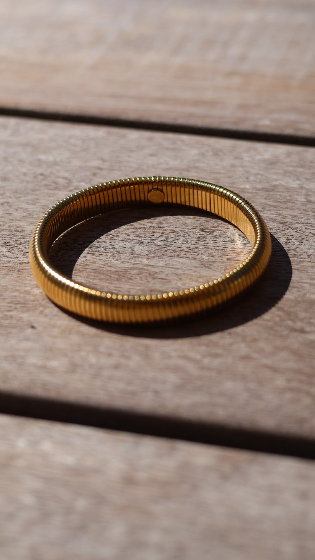 Ce joli jonc en métal doré, à la forme généreuse et moderne, séduit par son design minimaliste et sa légère élasticité qui lui permet de s’adapter facilement à une grande variété de poignets.