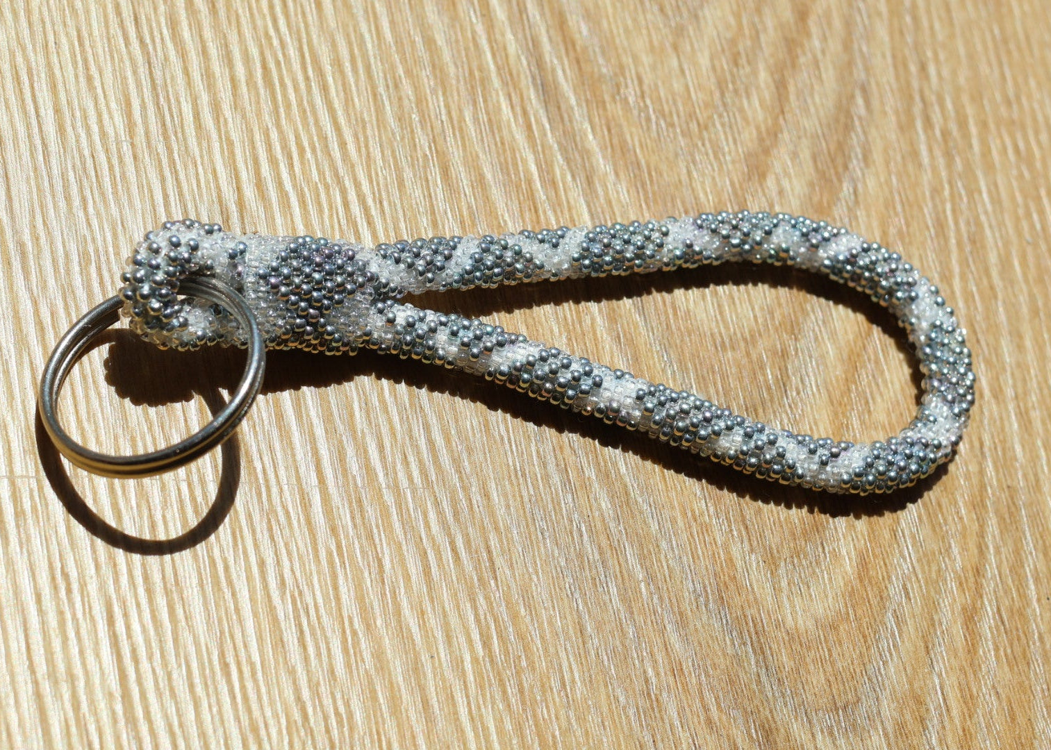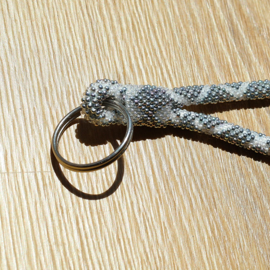 Chaque porte-clés nécessite en moyenne 3h30 de travail manuel. Les perles de verre sont tissées à la main avec patience et précision, puis montées sur un anneau brisé robuste pour une utilisation quotidienne.