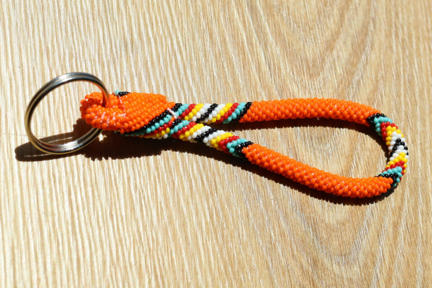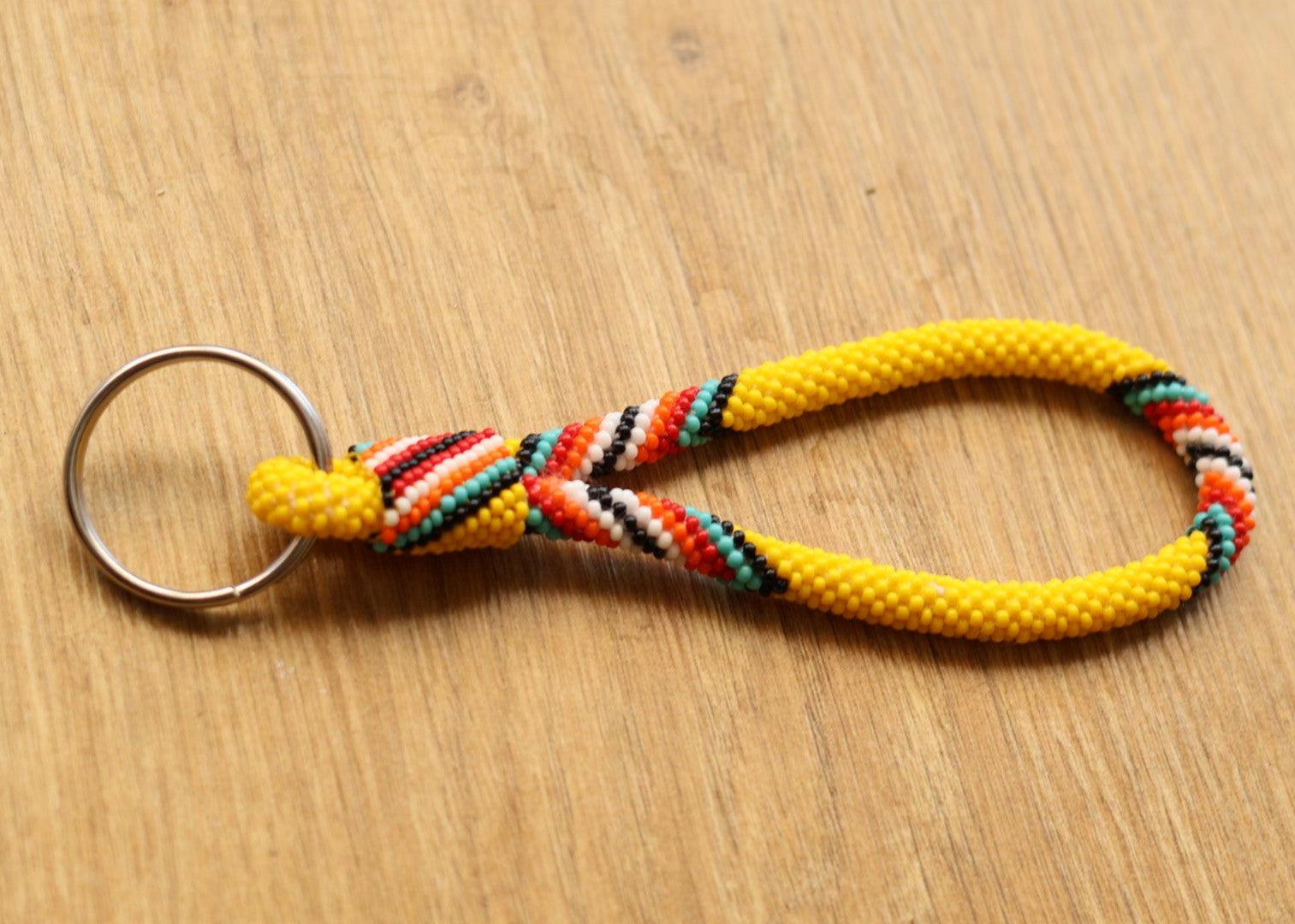 Chaque porte-clés nécessite en moyenne 3h30 de travail manuel. Les perles de verre sont tissées à la main avec patience et précision, puis montées sur un anneau brisé robuste pour une utilisation quotidienne.
