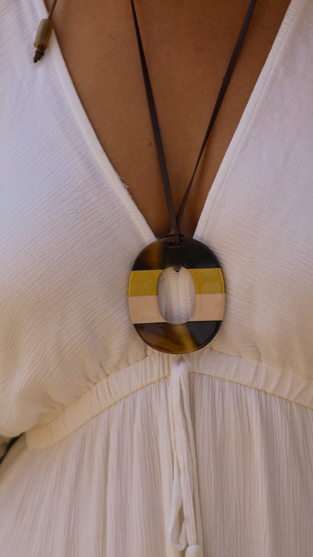 Monté sur un lien tissé waxé, solide et souple, le collier se règle facilement grâce à deux pièces coulissantes également en corne, permettant d’ajuster la hauteur selon votre tenue ou votre envie.