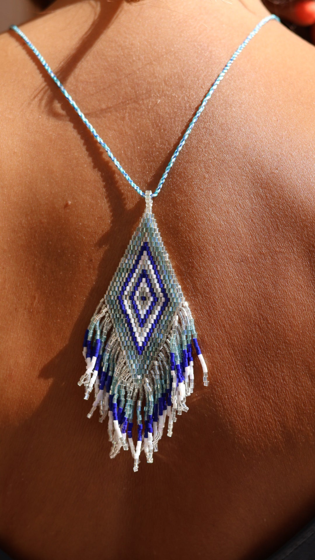 Le sautoir Anaya est une pièce élégante et artisanale, directement venue d’Inde. Monté sur un fil tissé, il se compose d’un pendentif ajouré de forme ovale (12 x 6 cm), aux reflets verts intenses, et se termine par deux pompons fins et colorés, qui ajoutent une touche bohème délicate.